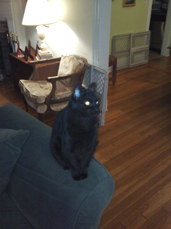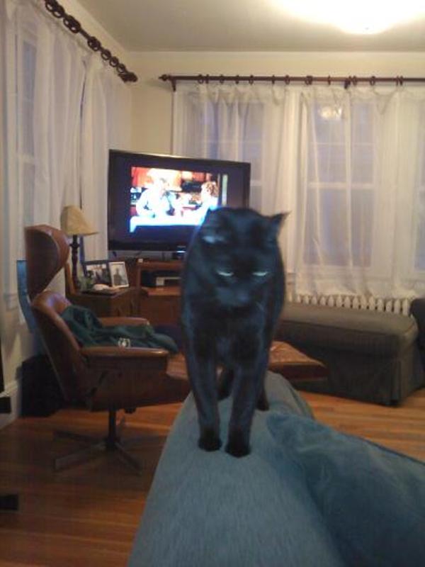 My wife and I are fostering my sister-in-laws cat. My brother is allergic and does not want the cat in their new house. As much as I call him a pu$$y (no pun intended), he recently had sinus surgery and is breathing freely for the first time in his life so I can't say I blame him. The cat is male, neutured, and de-clawed. He's black, about 8lbs, and is 9 years old. He's very friendly, my wife and I just don't want another cat (we had to put her 17 year old diabetic cat down back in 2006). His name is Sam and he gets along great with my 2 dogs. Its kind of hard to take a picture of a black cat, but this is the best I can do: [img]http://www.bertram33.com/images/uploads/sam1.jpg[/img] [img]http://www.bertram33.com/images/uploads/sam2.jpg[/img]
