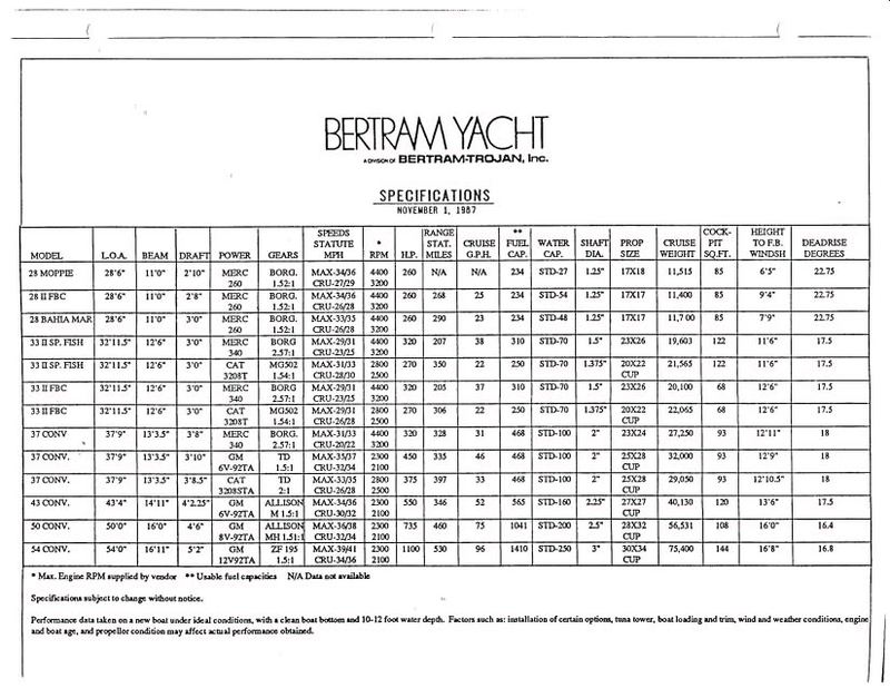 quote:Originally posted by dougl33 [img]http://www.bertram33.com/images/uploads ... cSheet.jpg[/img] Regards, Doug L. 1986 33 Bertram FBC Cummins 6BTA's Queen Elizabeth Marblehead, MA [img]http://www.bertram33.com/photogallery/p ... sabeth.jpg[/img] Off topic a bit but does anybody know all the original specs for a 1977 33' fbc? I see this chart is for 1987.